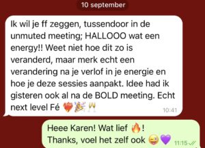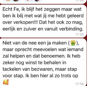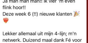 Mijn persoonlijke groei is echt x20 gegaan door de samenwerking met Fé, Door Fé ben ik veel eerlijker naar mezelf gaan kijken: waar ik mezelf klein houd, waar ik me aanpas, waar ik mezelf tekort doe. Tegelijk heeft ze me steeds gespiegeld in hoe krachtig ik juist ben. Mijn zelfbeeld, lef en eigenaarschap zijn daardoor zó hard gegroeid in een korte tijd, dat ik nu echt het gevoel heb: dit is wie ik ben, en hier ga ik niet meer van terugschakelen. Ik zie nu veel duidelijker waar mijn energie weglekt in mijn privé leven. Ik heb geleerd om daar bewuster in te kiezen, vaker nee te zeggen en niet overal meer “aan” te staan. Dat merk ik thuis direct in meer rust, minder overprikkeling en veel meer ruimte voor mij zelf.