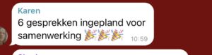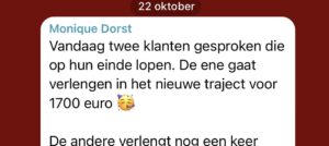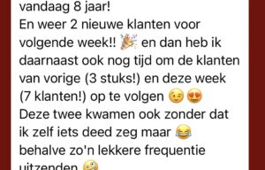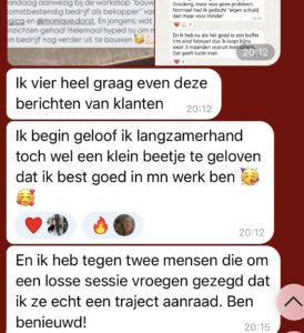 Ik wilde graag groeien in omzet; ik kon leven van mijn bedrijf, maar voelde dat het allemaal wel wat ruimer mocht. Mijn eerste doel was ongeveer 30% omzetgroei, en die heb ik ruim gehaald. Ik voel ook het vertrouwen dat ik dit niveau ga kunnen behouden, en voel alround sowieso meer vertrouwen in mezelf en mijn bedrijf. Ik kan mijn klantresultaten veel beter voelen, complimenten daarover beter aannemen, en eerlijker naar potentiële klanten communiceren wat ik voor hen kan betekenen. Mijn nieuwe productaanbod en strategie voelen ook ruimer en lichter dan het oude. Het is overzichtelijker en dat geeft niet alleen meer ruimte in mijn agenda, maar ook in mijn hoofd.