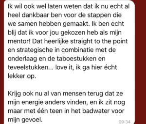 Ik was al een jaar bezig met mijn eigen bedrijf, maar zonder succes. Ik voelde ook dat ik mezelf in alles verstopte. Jij raakte me precies op de plekken waar de echte 'zeer' zat. je spiegelde mij ontzettend goed daarin, waardoor ik heel snel voelde; ik heb haar nodig haha