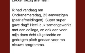 Super gaaf! Ik had niet verwacht dat ik het zo leuk zou vinden om op een podium te staan. Dat ik het durfde wist ik wel, maar dat ik er zoveel plezier uit zou halen? Dat was een kant van mezelf die ik echt heb ontdekt op deze dagen. Toen ik merkte hoe leuk ik het vond om echt te entertainen, ben ik ook meer storytelling gaan toepassen in mijn marketing. Ik heb veel ideeën om dit te verwerken in mijn podcast, en verwacht dat dit het bereik daarvan zal vergroten.