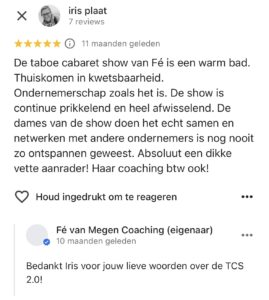 TCS 4.0: 5 activerende sprekers, 1 lachcoach, 2,5 uur netwerken, 2 uur aan Show, activiteiten, energizers en FUN.