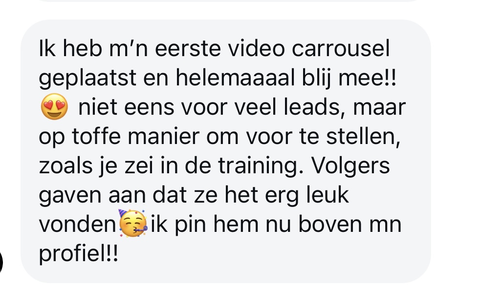 • En let op: NIET meer online hoeven zijn, deze carrousels (indien de juiste opbouw) gaan door het dak, tot zelfs maanden na je post ontvang je leads!