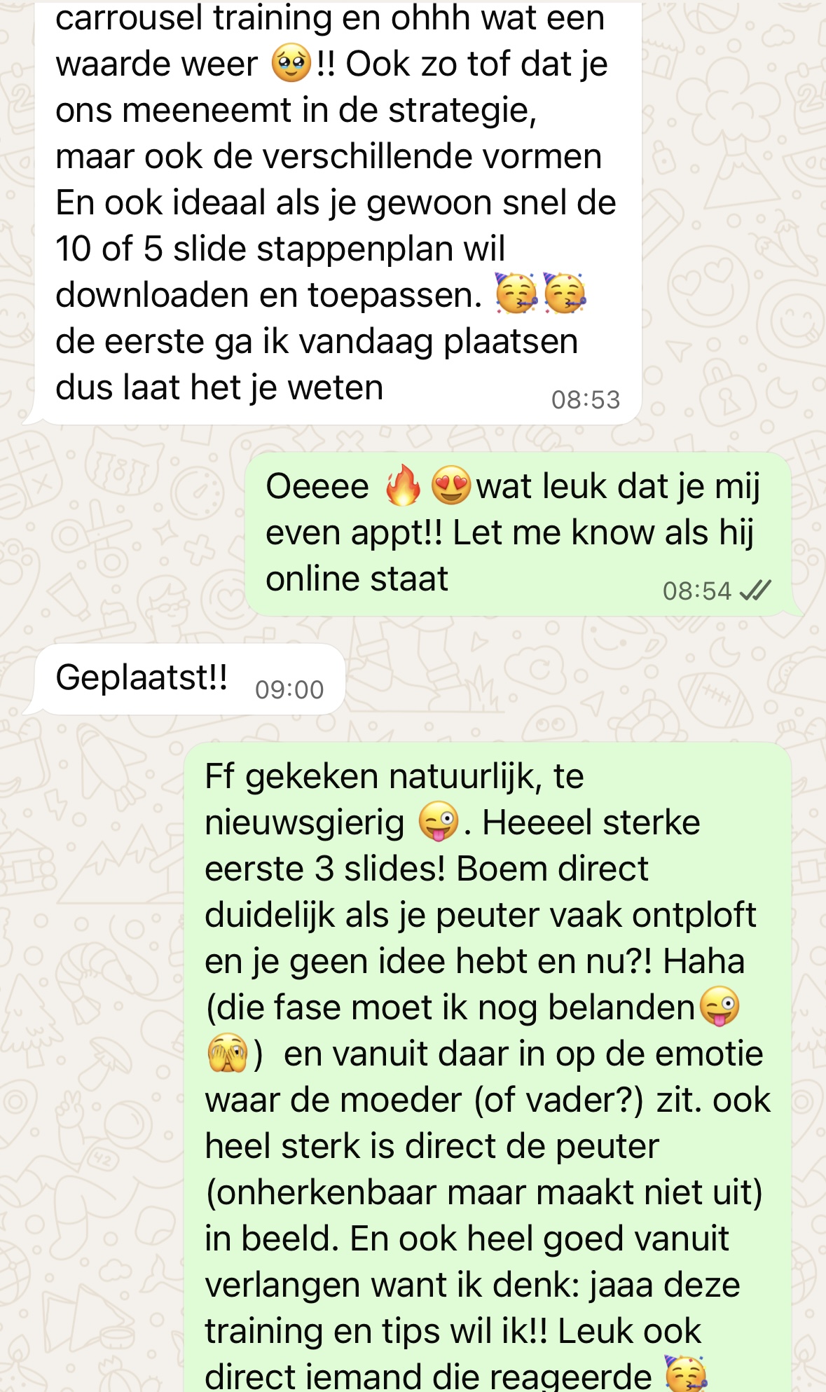 Zoals Lidewij goed deed in haar carrousel, is het direct benoemen vanuit klanttaal. Binnen een paar minuten had ze aanmeldingen voor haar training met tips.