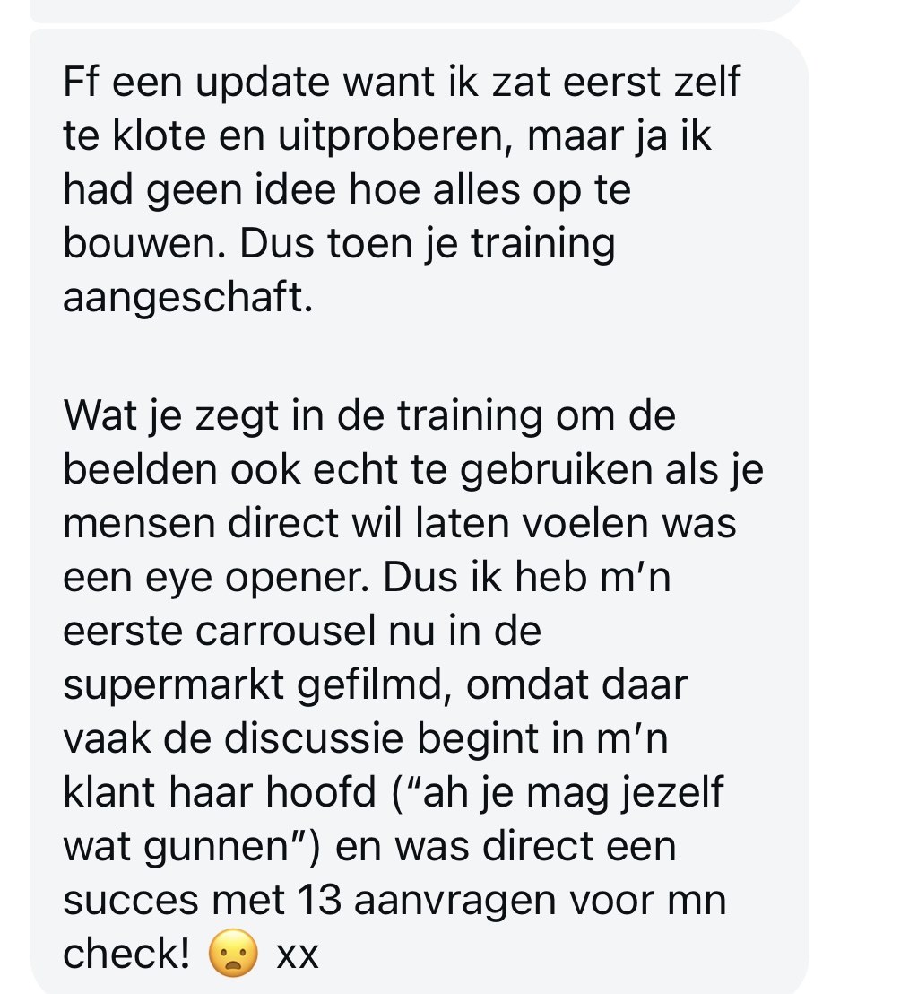 'Mijn eerste carrousel heb ik gefilmd in de supermarkt, omdat daar vaak de discussie begint in mijn klant haar hoofd. En dat was direct een succes met 13 aanvragen voor mijn check!'